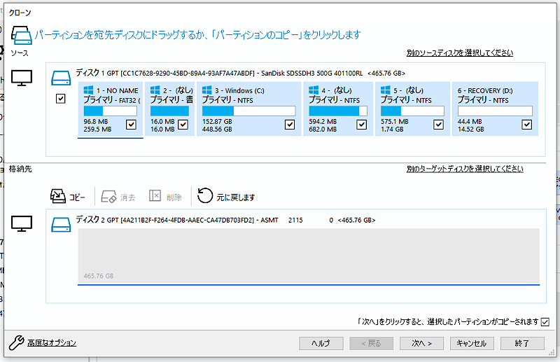 👉 コピー元(HDD)とコピー先(SSD)を間違えないこと